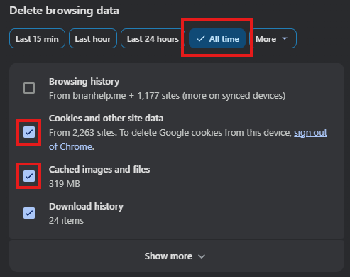 Check the boxes next to "Cookies and other site data" and "Cached images and files.”